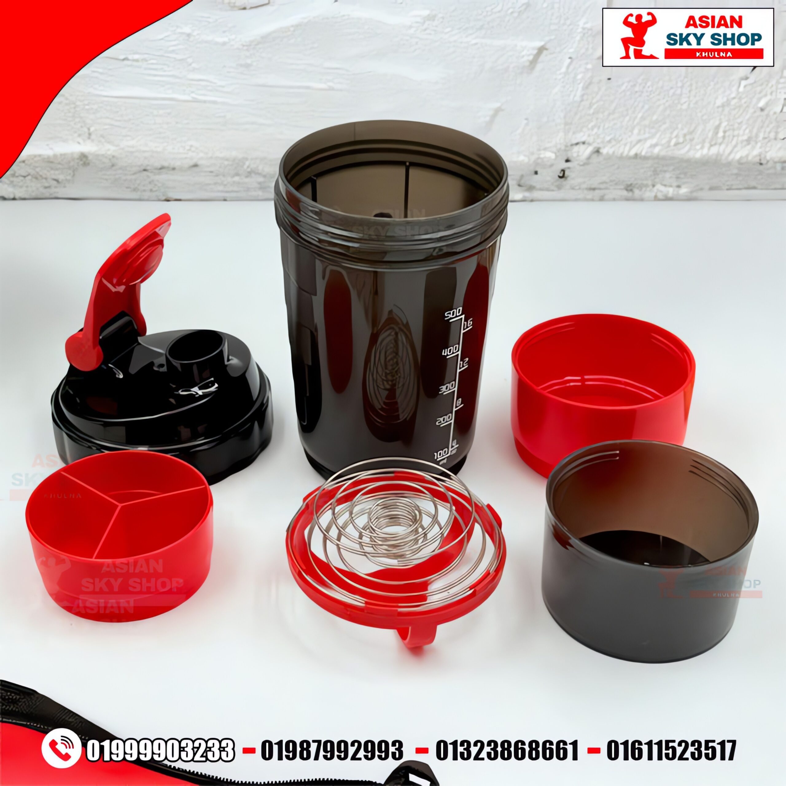 • স্মার্ট স্টোরেজ সিস্টেম: এই বোতলের সাথে আছে অতিরিক্ত ২টি কম্পার্টমেন্ট (Storage Containers)। একটিতে আপনি প্রোটিন পাউডার এবং অন্যটিতে ভিটামিন ক্যাপসুল বা ট্যাবলেট (Pill Container) বহন করতে পারবেন।