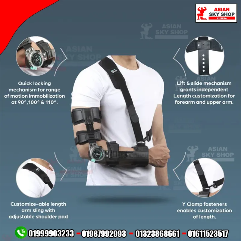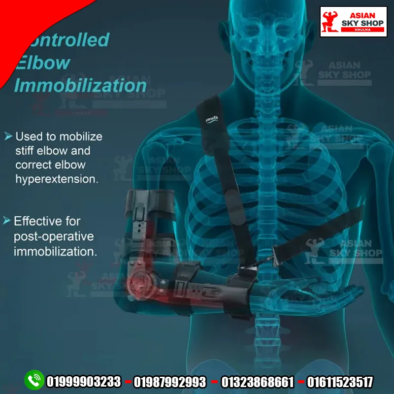 • Advanced Range of Motion (ROM) Control: এর উন্নত ডায়াল সিস্টেমের মাধ্যমে কনুইয়ের ভাঁজ হওয়া (Flexion) এবং সোজা হওয়া (Extension) নির্দিষ্ট ডিগ্রিতে লক করে রাখা যায়।